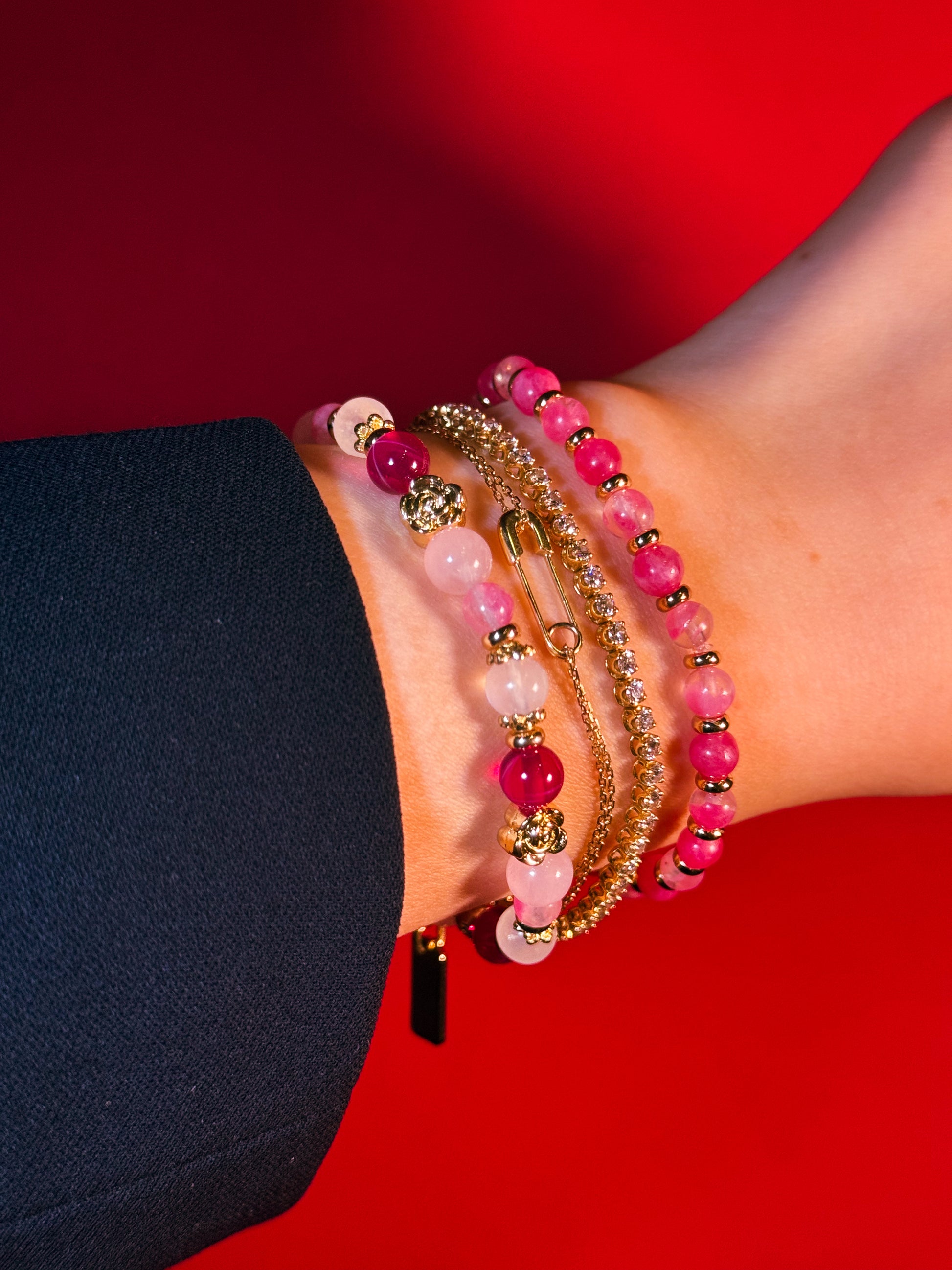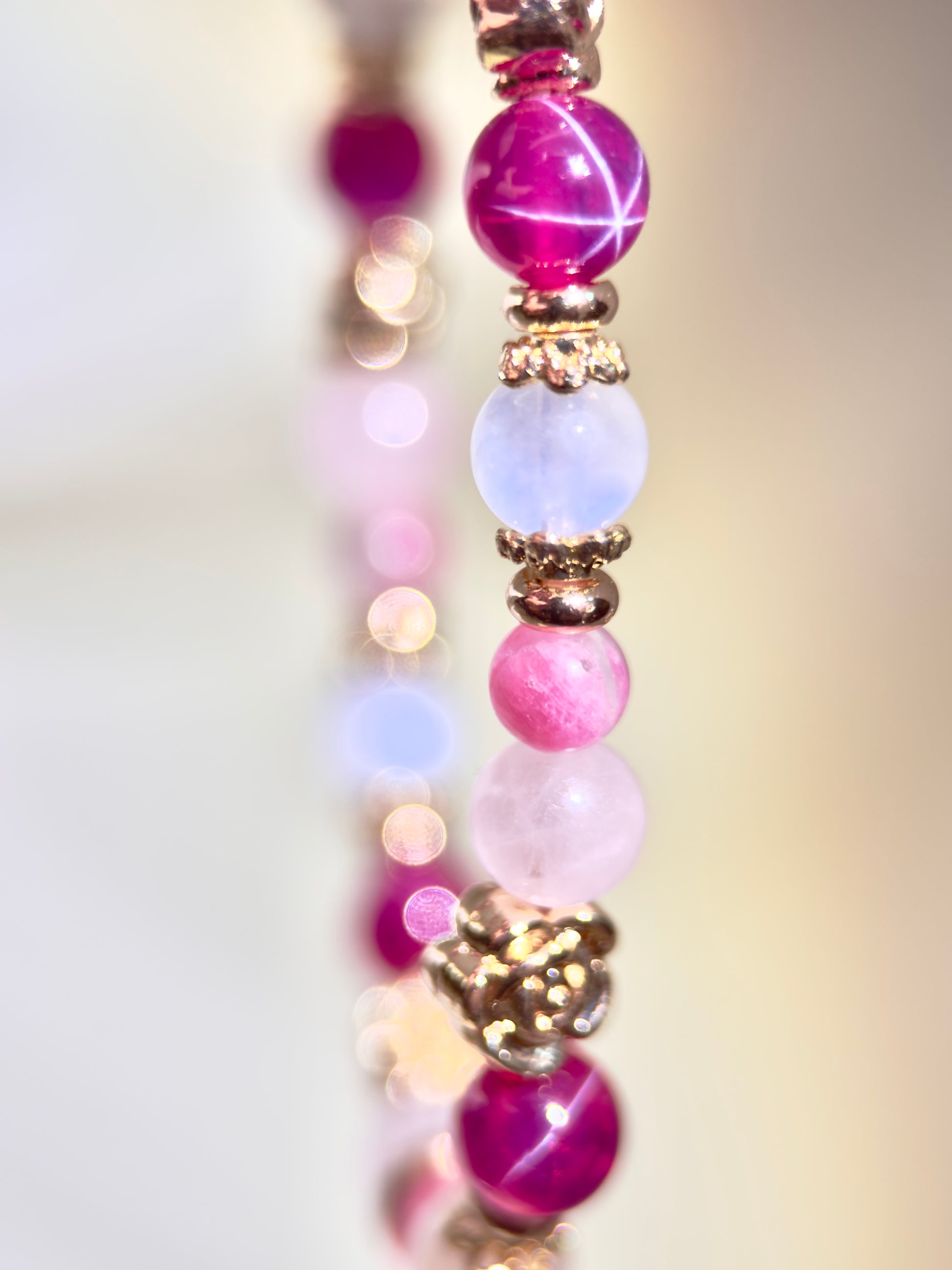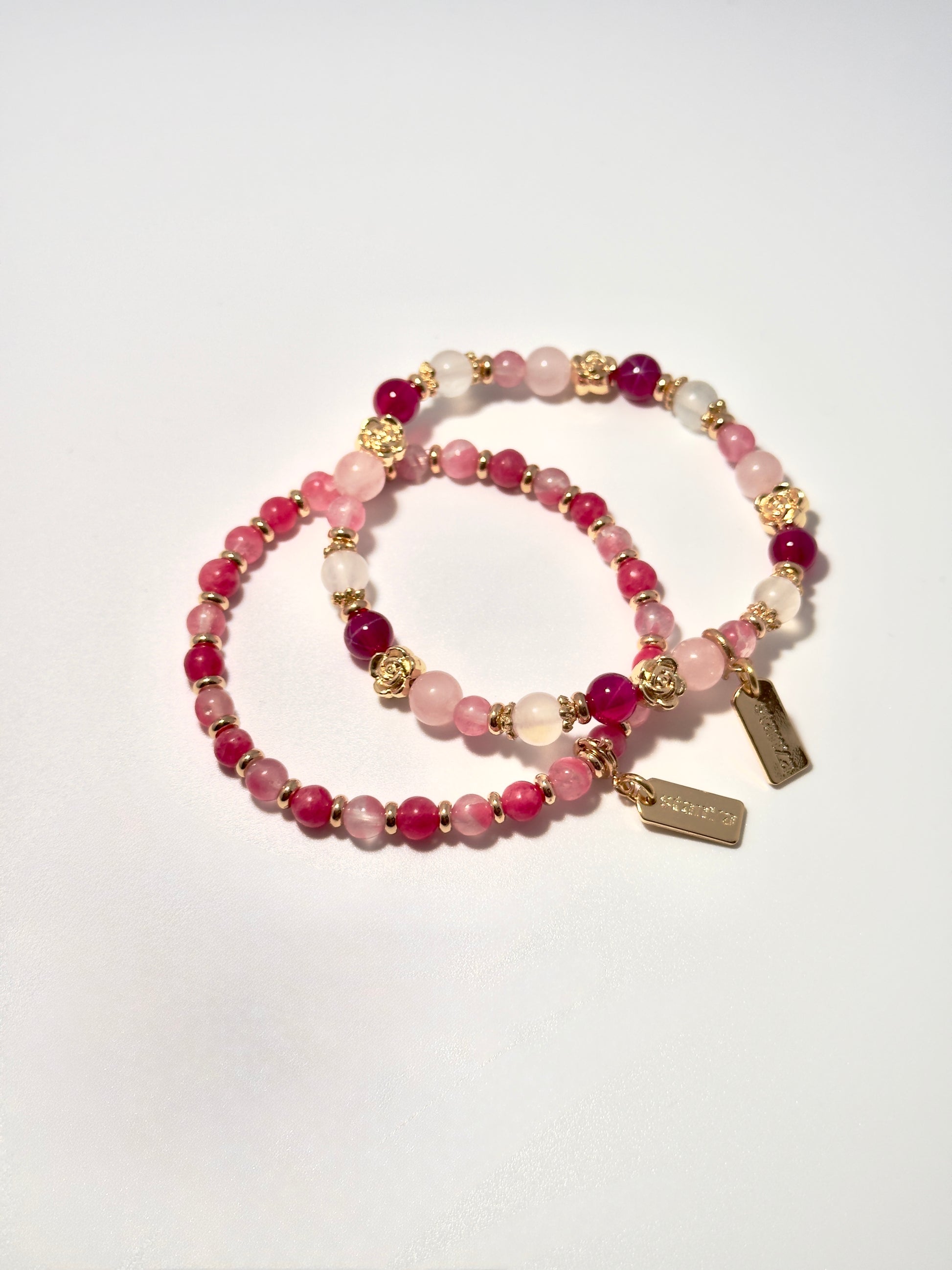 Step into the city in Roseline, a lively and luminous spring-inspired set of bracelets and bag charm. Rose Quartz and Star Ruby glow in soft pink and bold red, layered with a Sakura Rhodonite mini beads that add an effortless touch, like petals caught in a breeze.