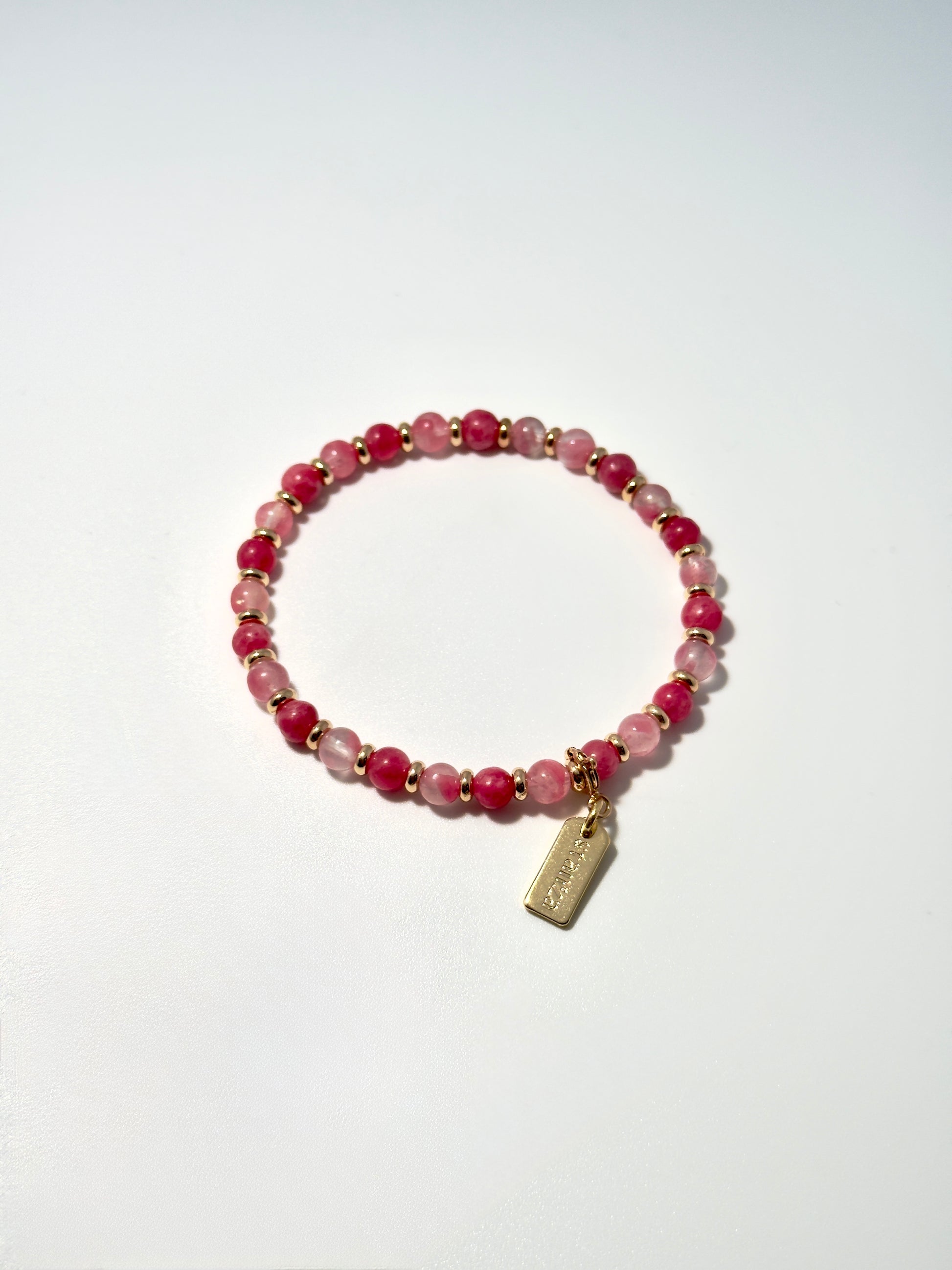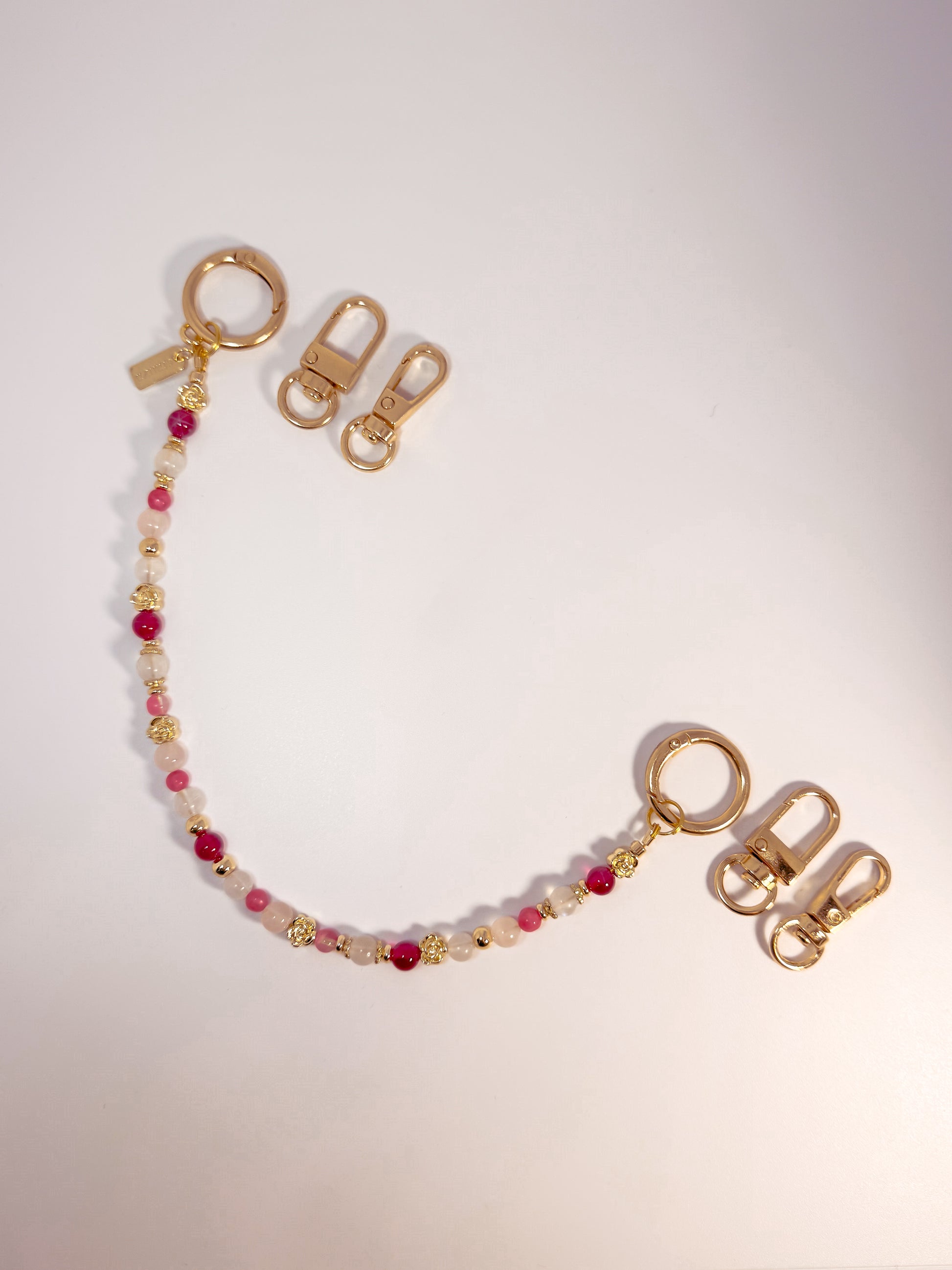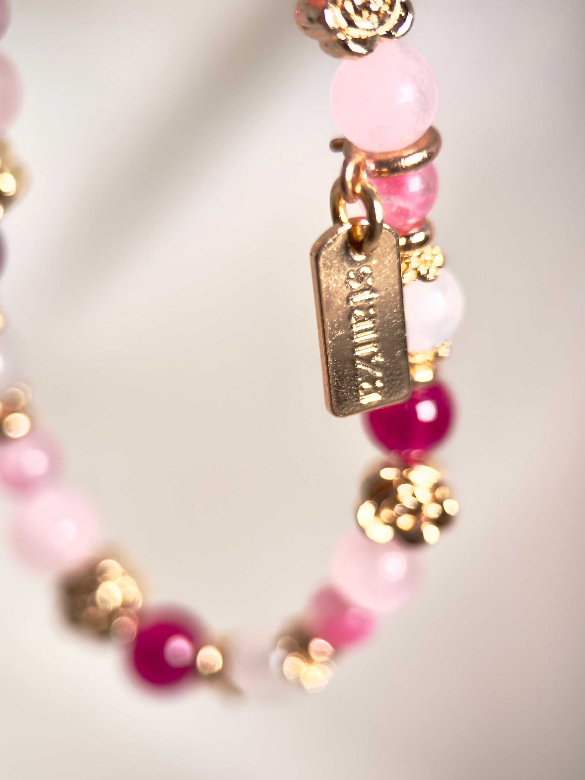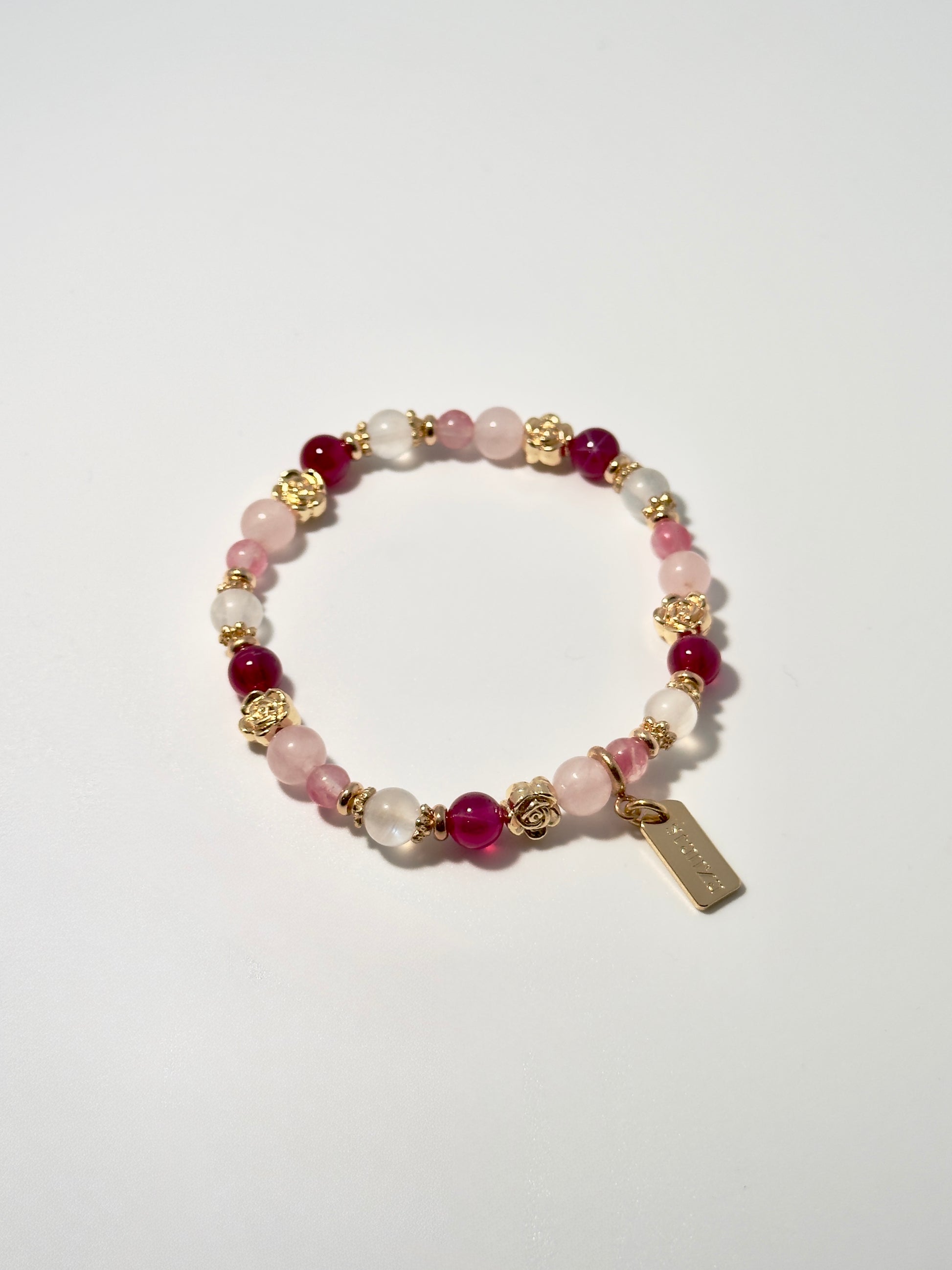 Step into the city in Roseline, a lively and luminous spring-inspired set of bracelets and bag charm. Rose Quartz and Star Ruby glow in soft pink and bold red, layered with a Sakura Rhodonite mini beads that add an effortless touch, like petals caught in a breeze.