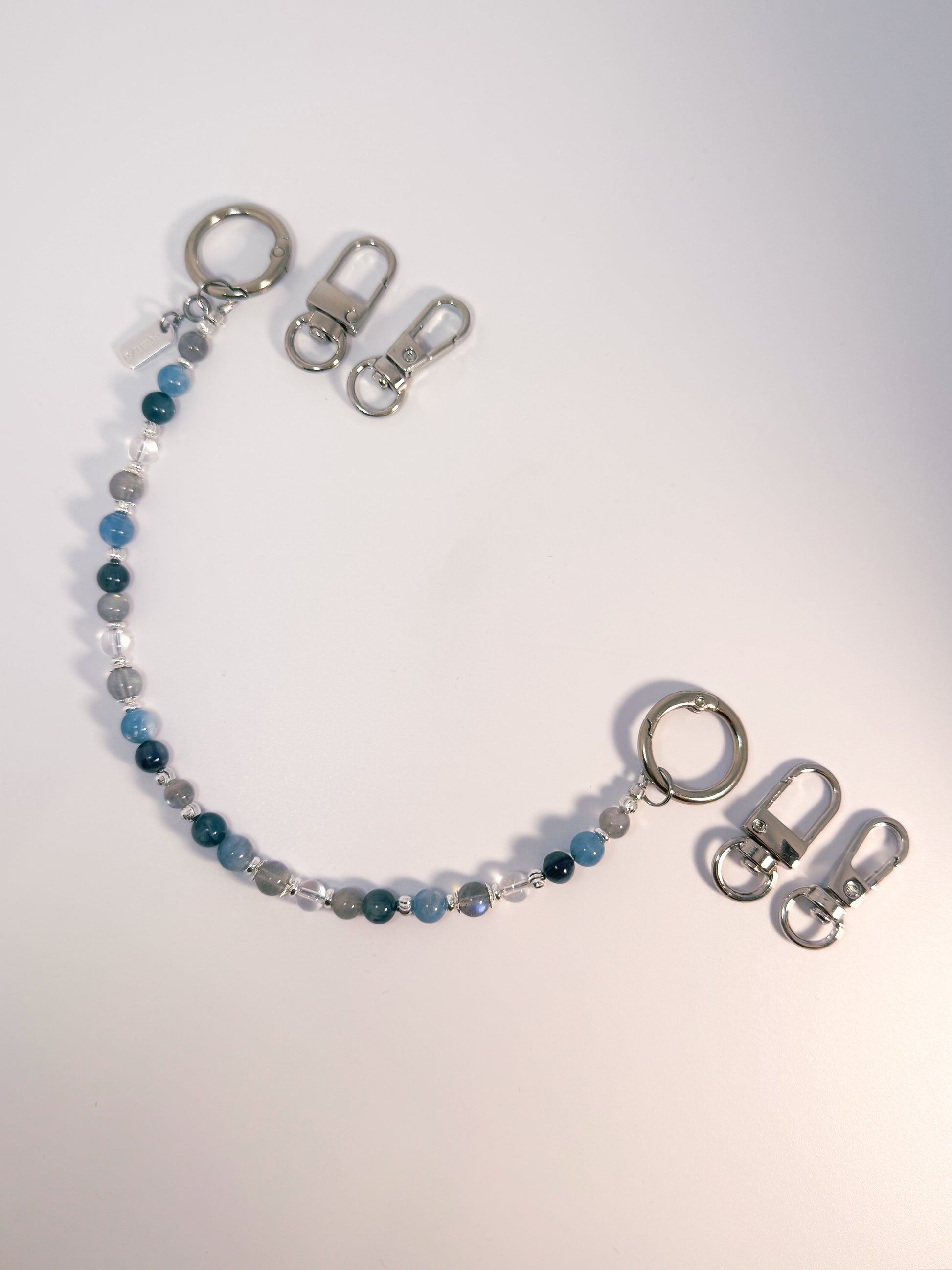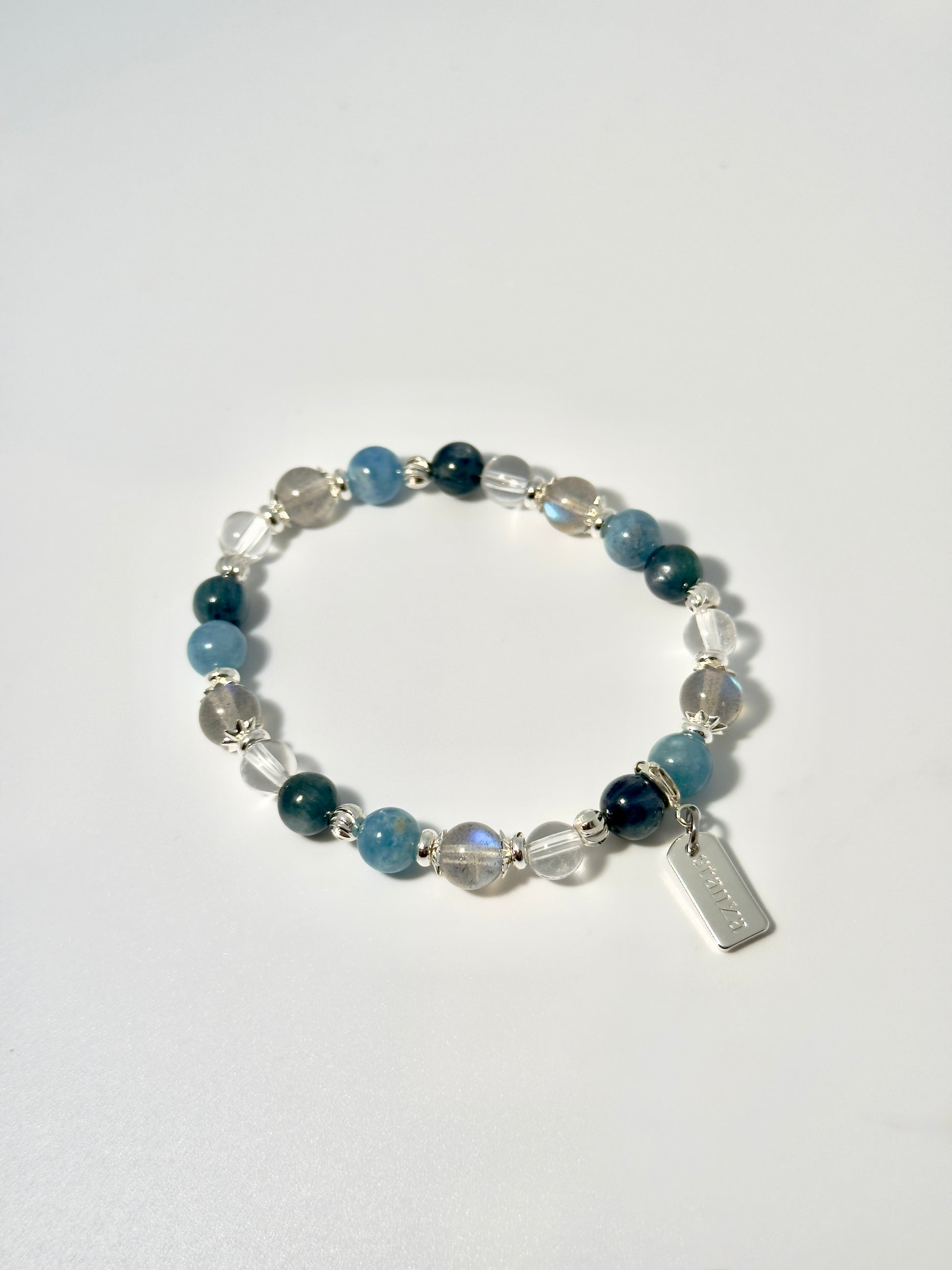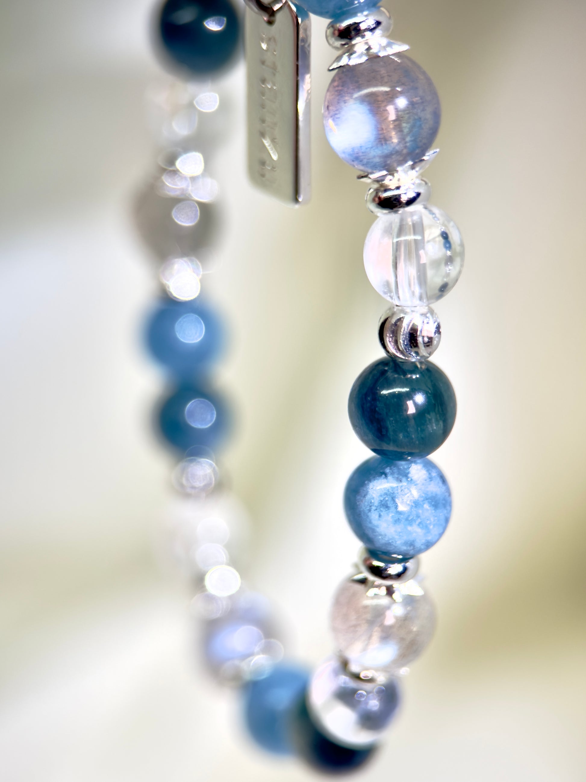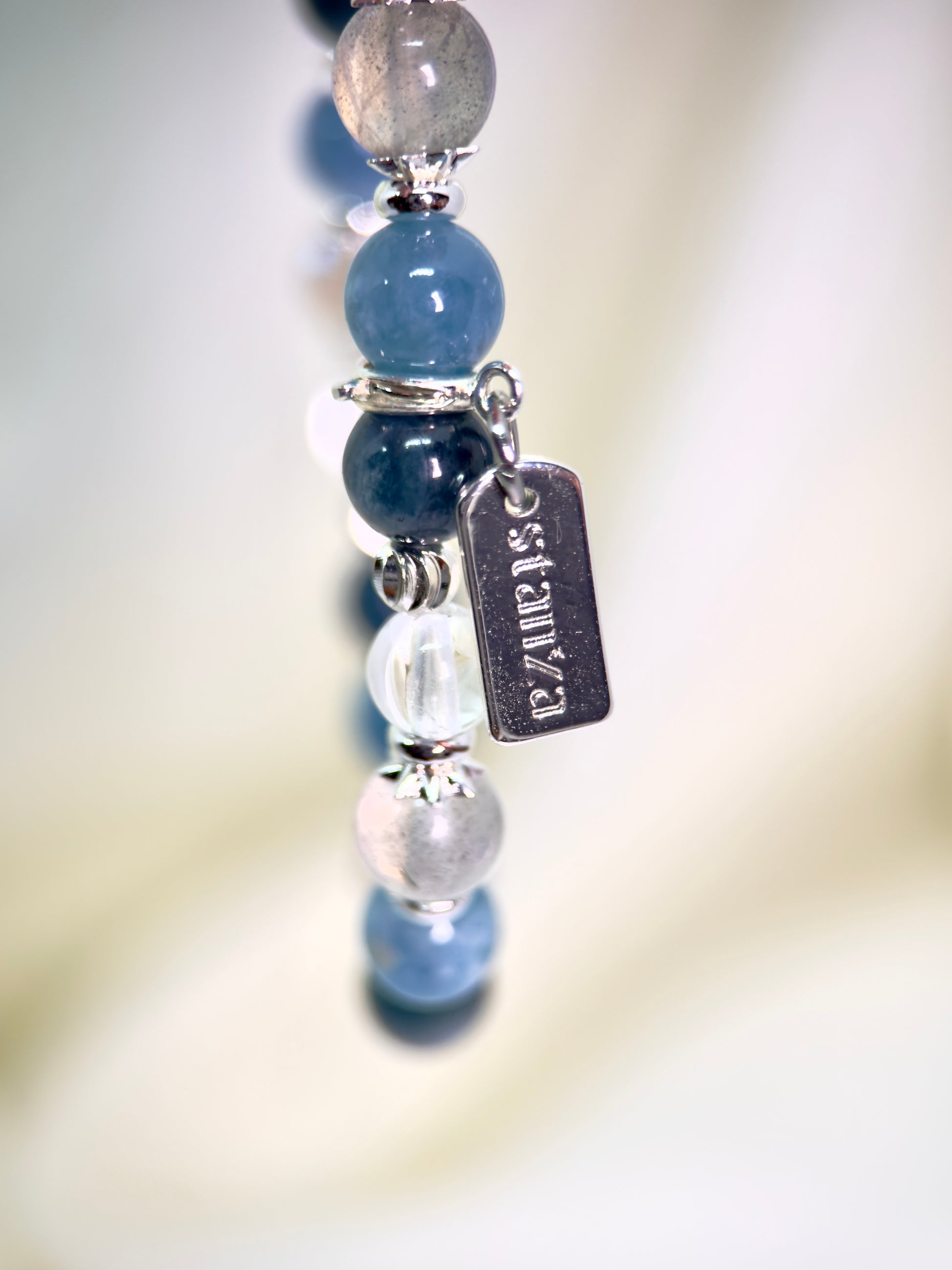 Serenade is a study in cool blue harmony. Made with Kyanite, Island Aquamarine, Labradorite, and Clear Quartz, each crystal reflects a quiet luminosity, like the stillness of an early morning sky or the soft rhythm of waves meeting the shore. A gentle composition of blue, crafted for those who carry their calm with them.