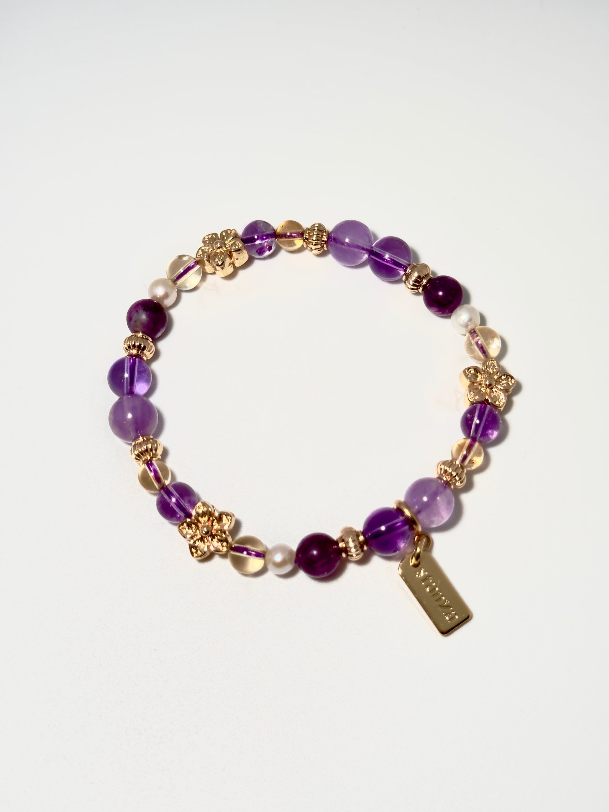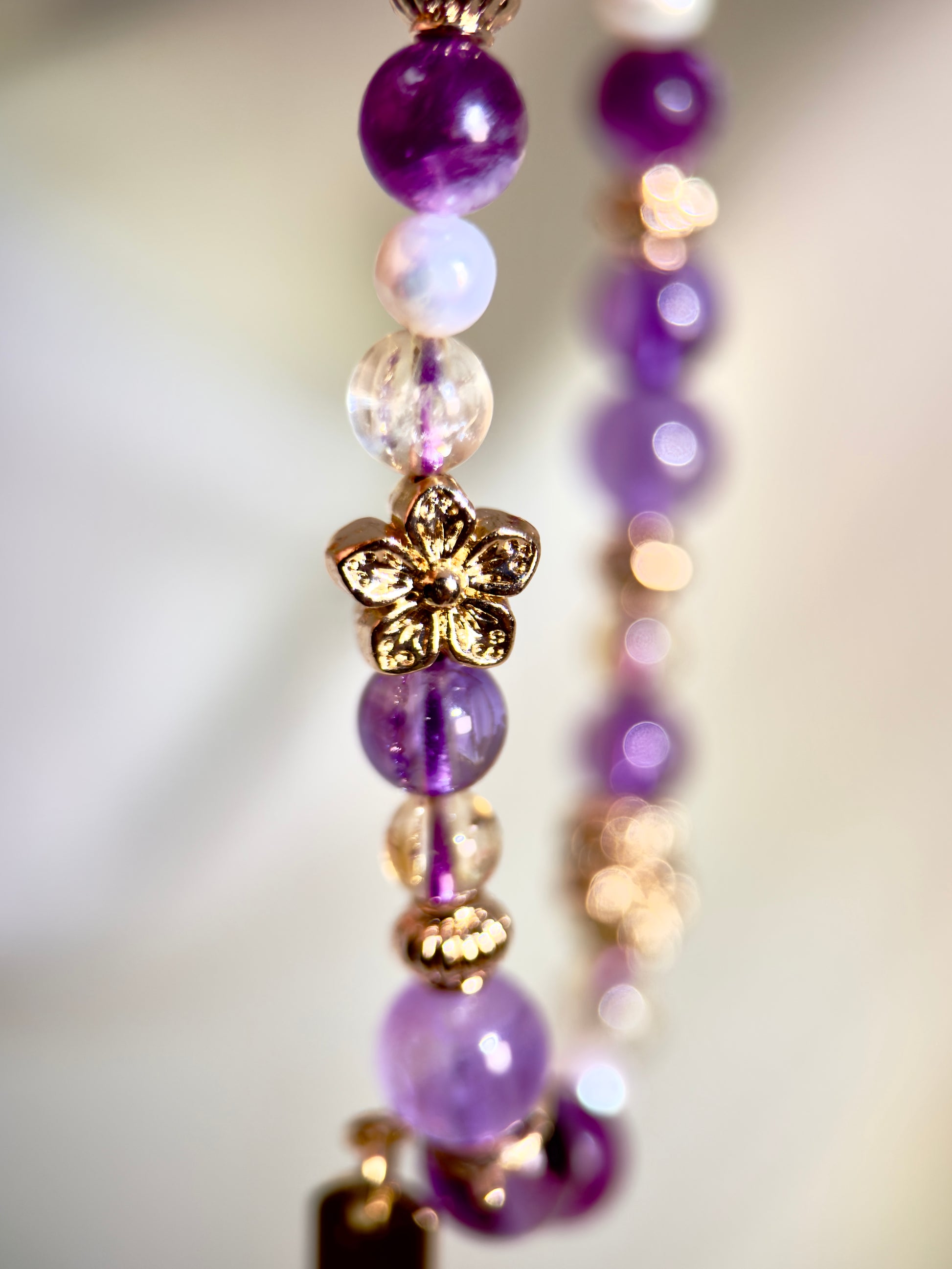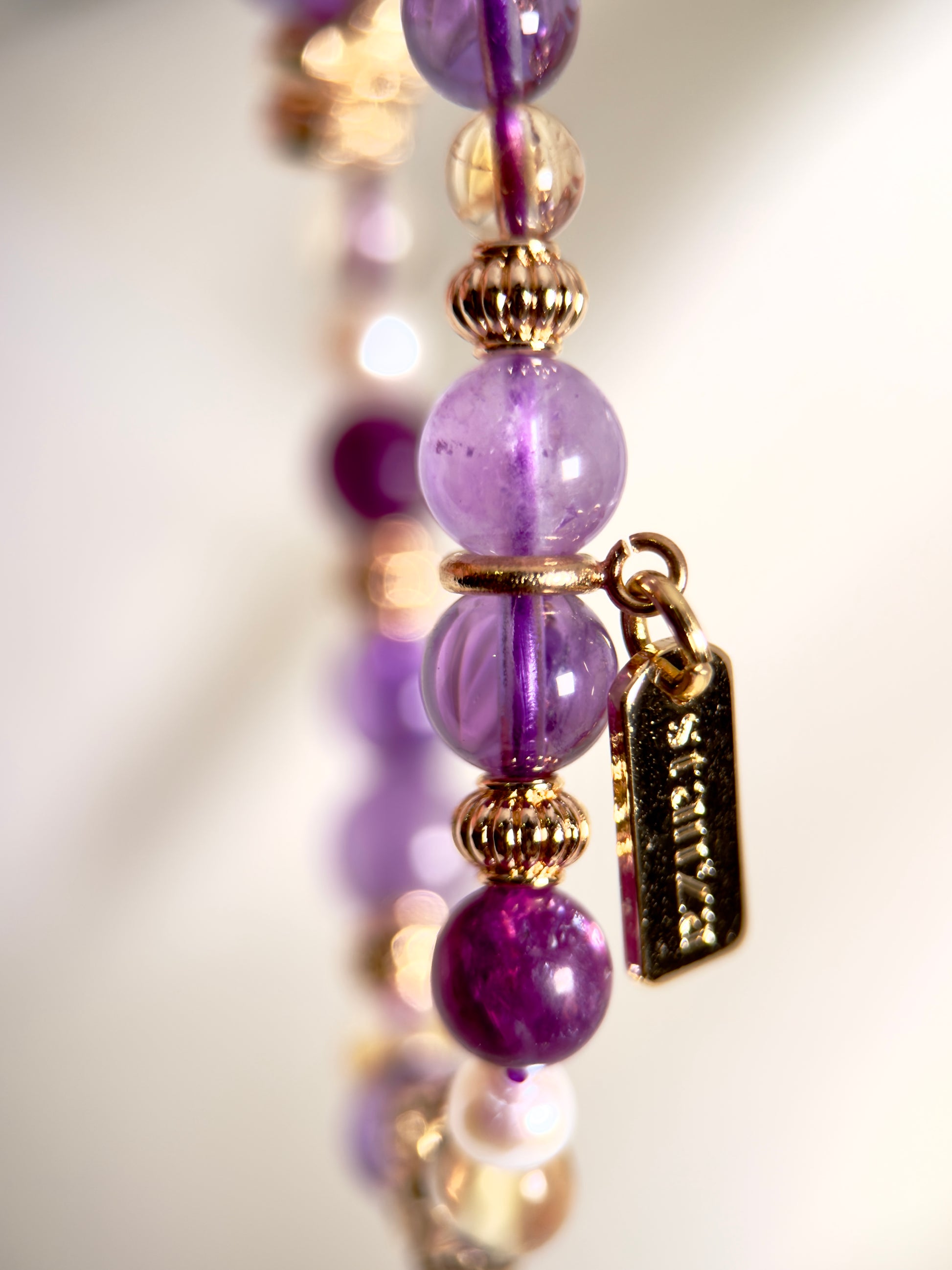 Crystals: Amethyst, Bolivian Amethyst, Purple Mica, Citrine, Freshwater Pearl