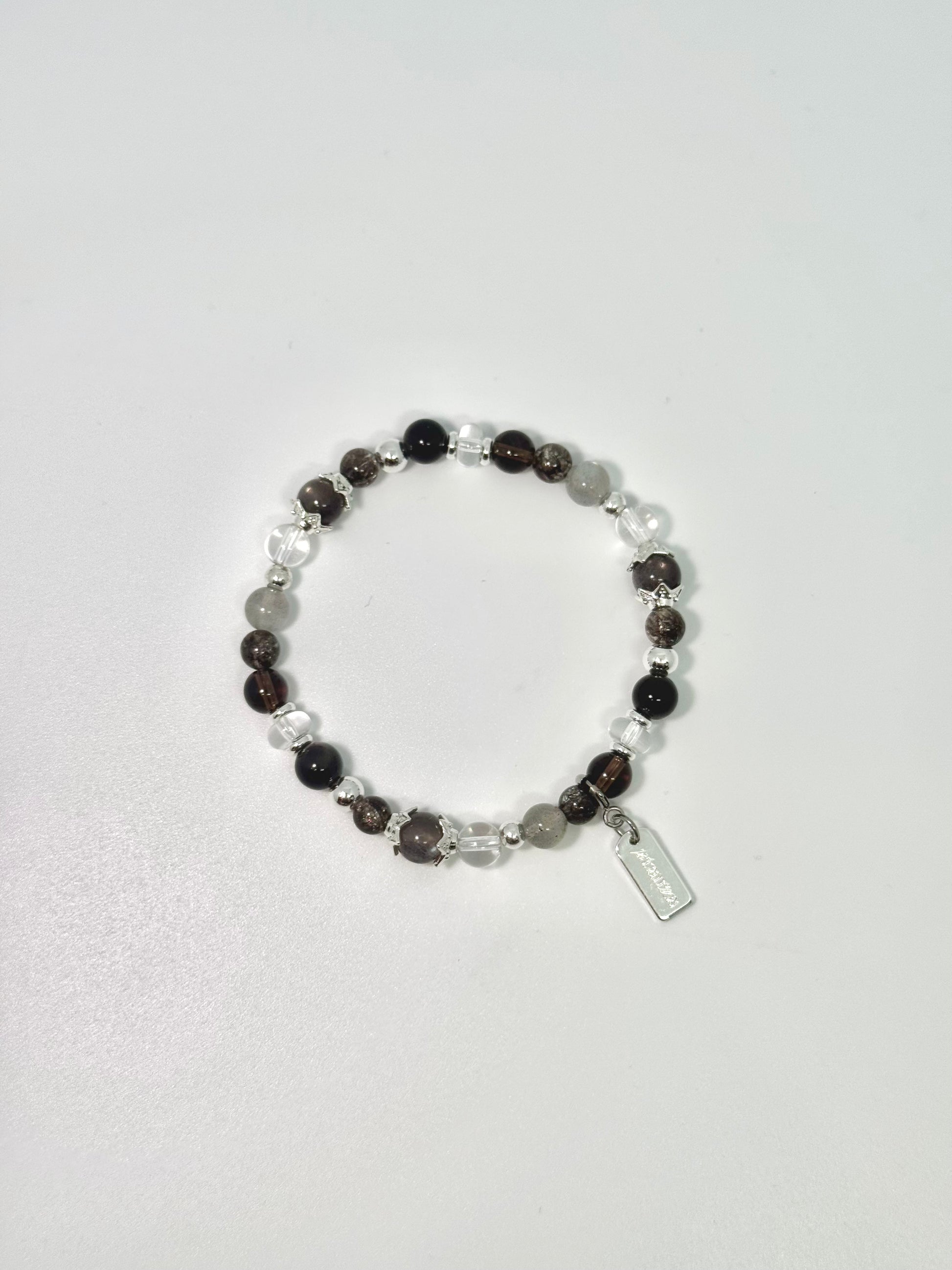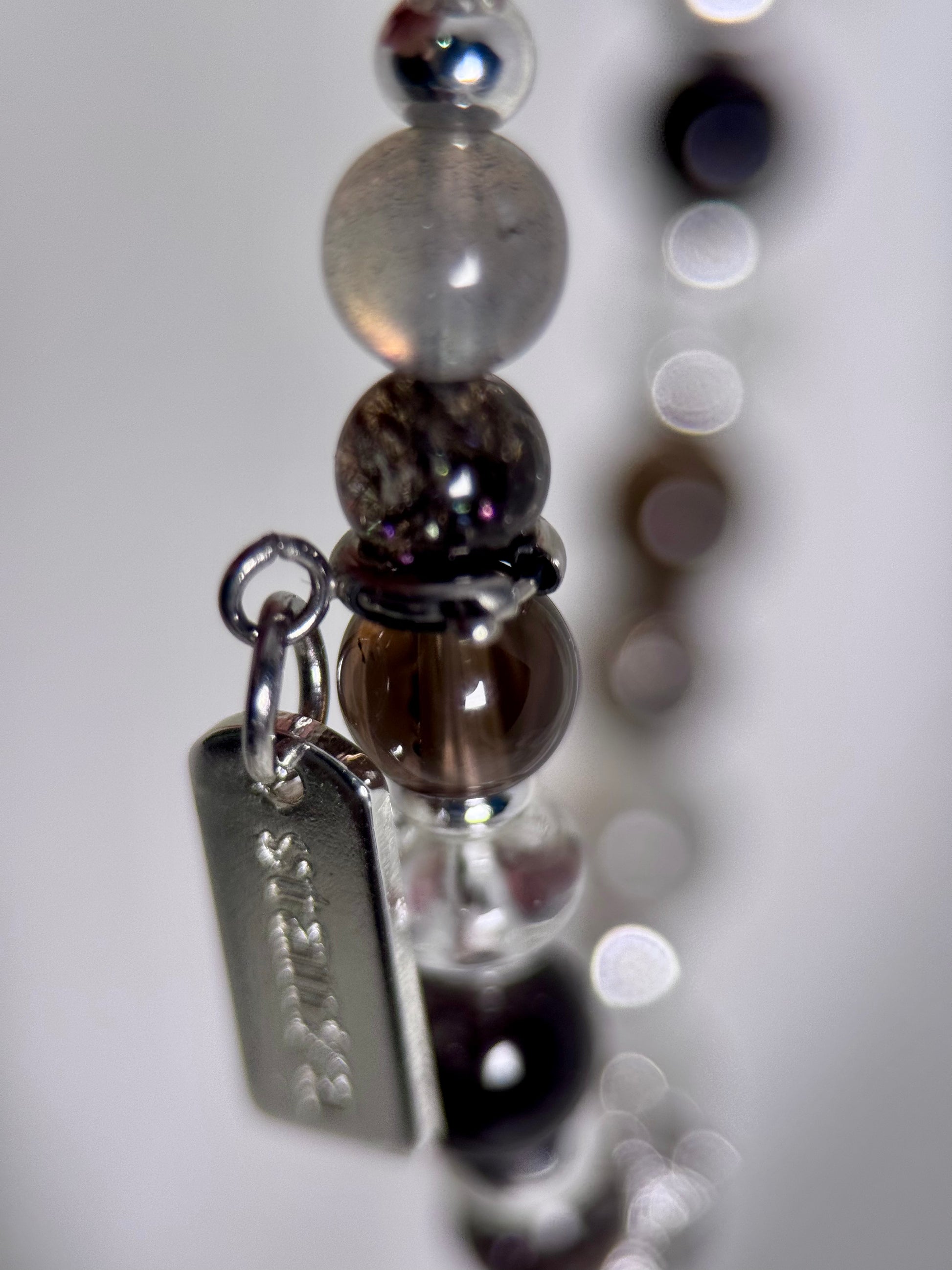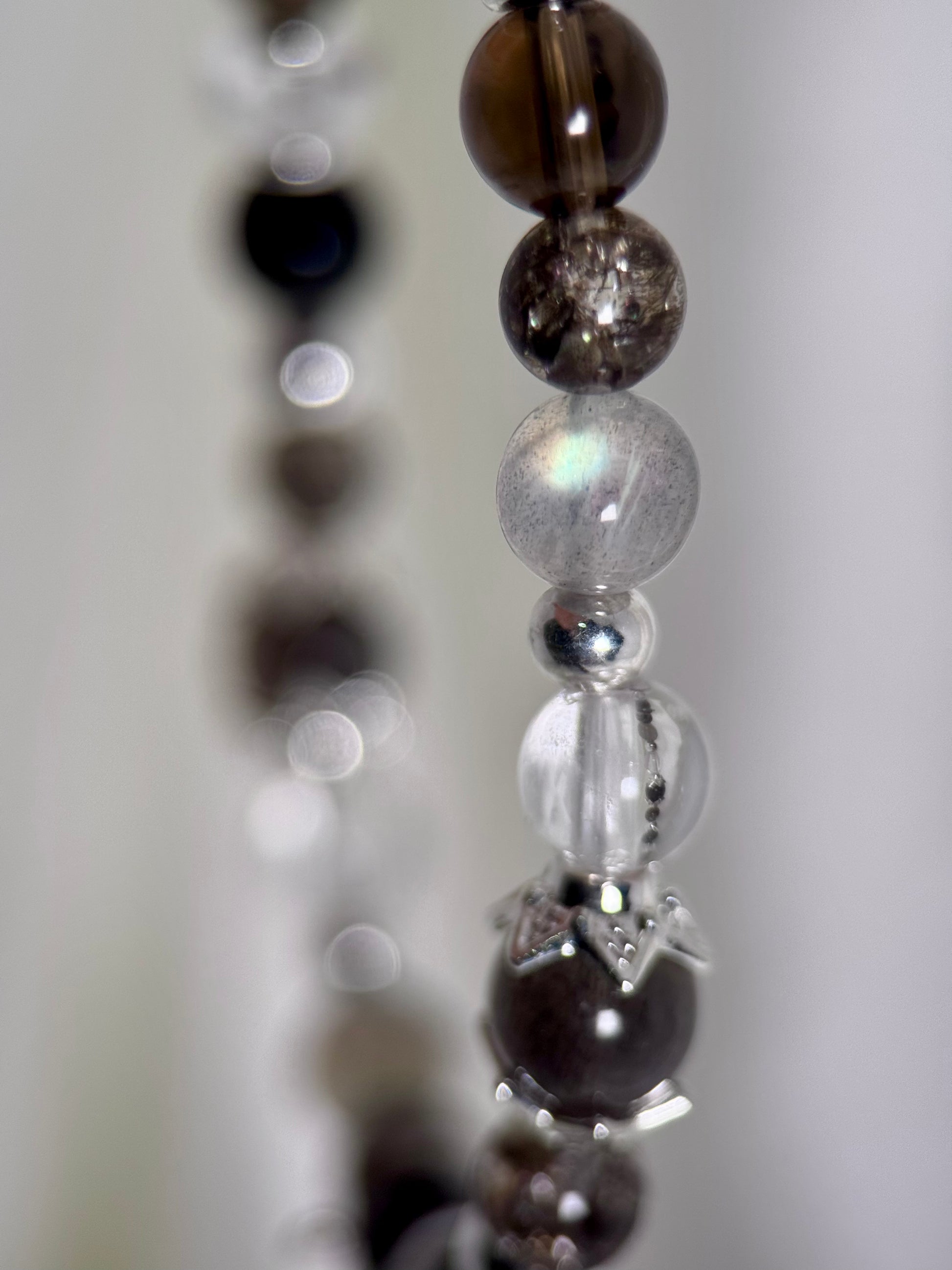 Inkstone layers black, smoky grey, and crystal-clear light — a palette carved from shadow and clarity. Made with Skeletal Moonstone, Silver Obsidian, Smoky Quartz, Fireworks Super 7, and Clear Quartz, each piece carries a quiet force, a sleek precision, a kind of strength that doesn’t need to raise its voice. Cool edges, bold contrasts, and a distilled elegance.